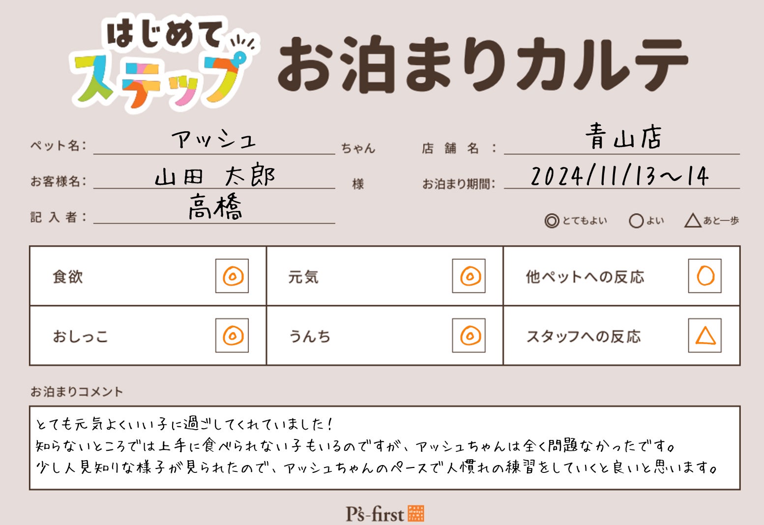 また、はじめてステイ中は、「ペッツファースト社会化トレーナー資格」を持つ店舗スタッフが、社会化の進度チェックをし、その結果をカルテとして飼い主様にフィードバックいたします。