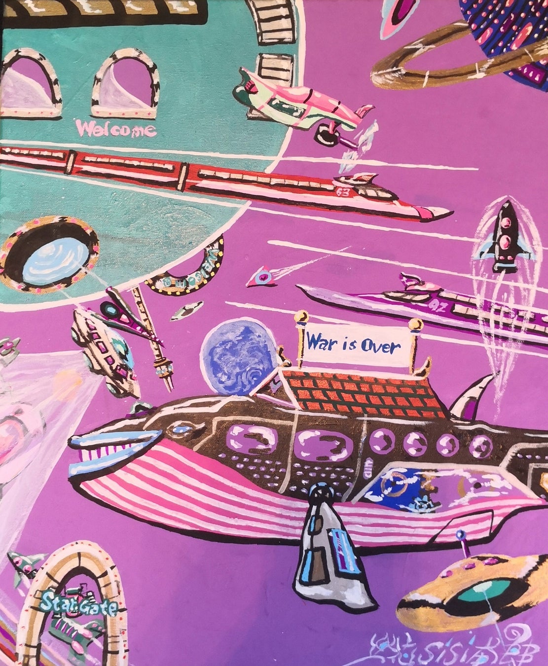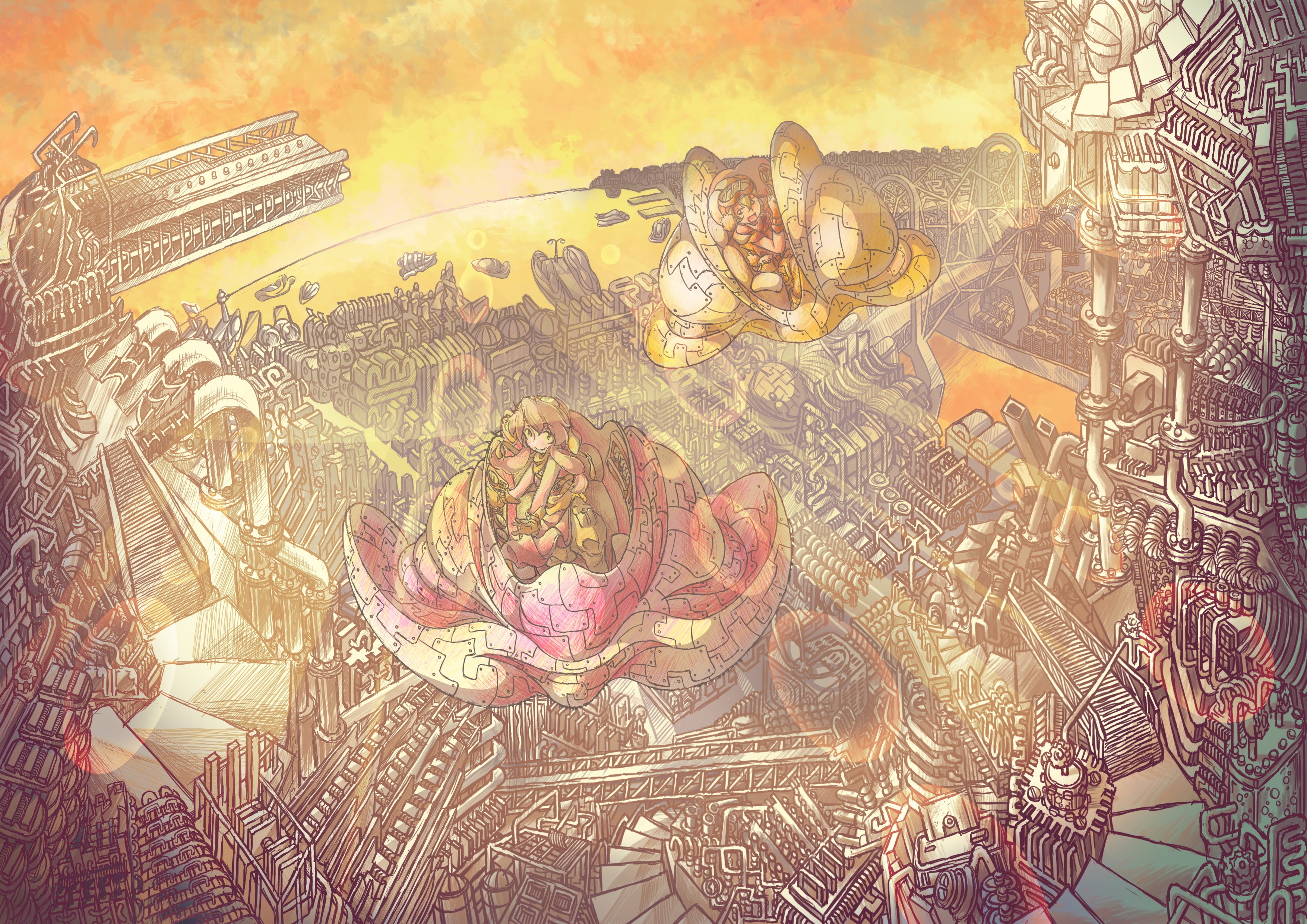 竹ちょさん(日本)作品:『未来都市を巡る旅人たち』