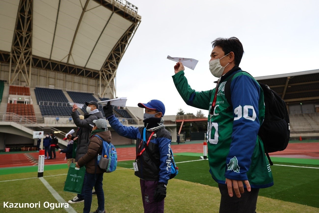 グリーンロケッツ東葛のマスコット「スティーム」のデザインが入った特別仕様の折り紙で紙ヒコーキを作成し、選手が戦うグラウンドにて参加者全員で飛ばすイベントです。