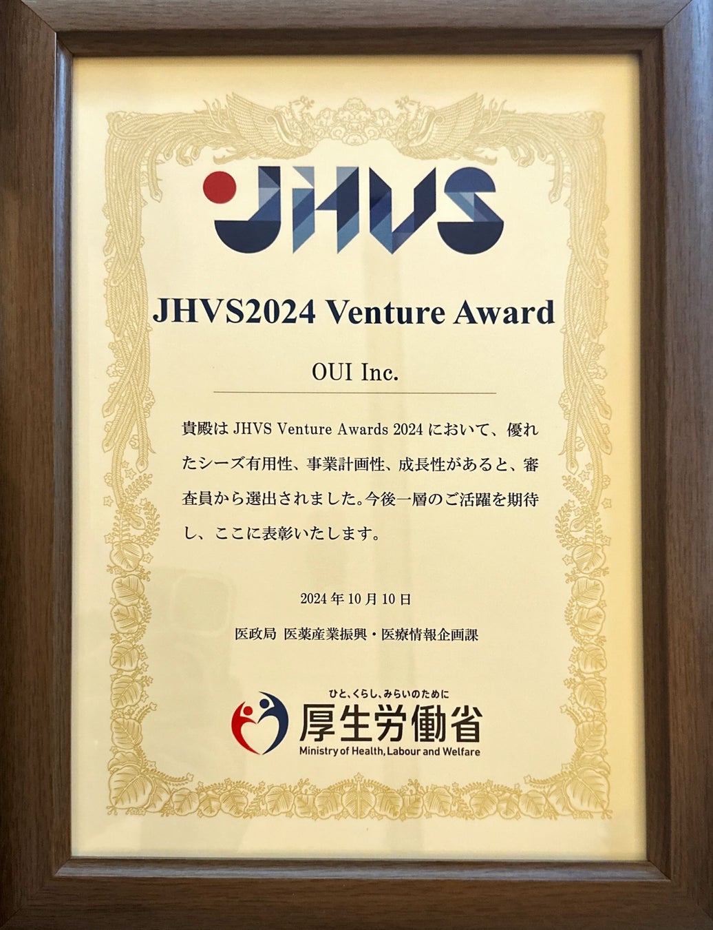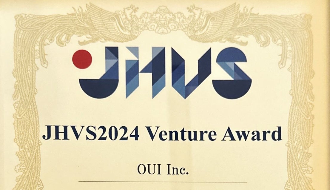 OUI Inc.(株式会社OUI、本社:東京都港区、代表取締役:清水映輔)は、2024年10月10日に開催された「JHVS Venture Awards 2024」において、審査員特別賞を受賞しました。