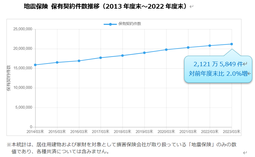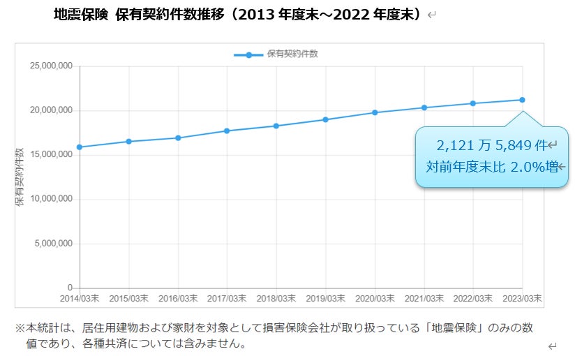 地震保険 保有契約件数 最高値を更新2,121万5,849件(2022年度末現在、対前年度末比2.0%増)