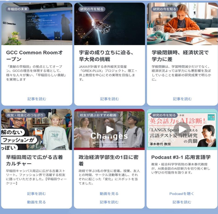毎週1回、早稲田の”いま”と”これから”を伝える複数本のニュース、動画・音声コンテンツを発信します。ニュース、動画・音声コンテンツは「①学生・校友の活躍」、「②研究の今を知る」、「③教育の今を知る」、「④校友・社会とのつながりを感じる」、「⑤スポーツ・文化を楽しむ」、「⑥早稲田の未来」のいずれかの内容で発信予定です。