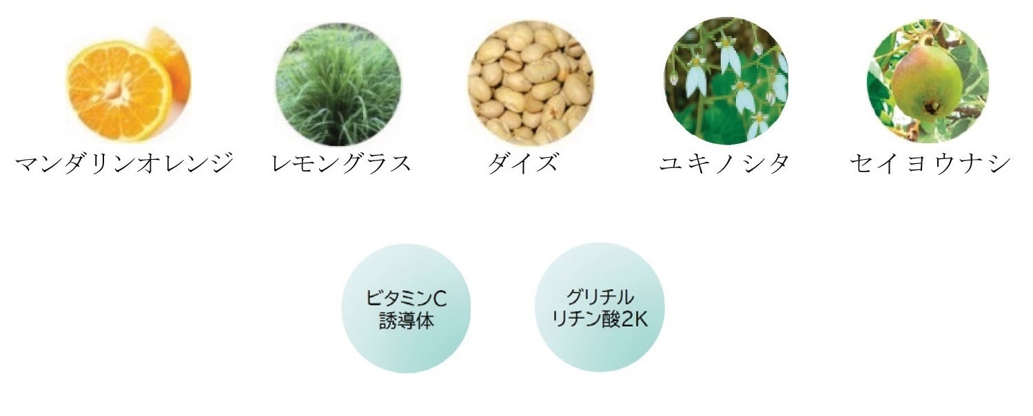 *1 サッカロミセス/ハトムギ種子発酵液、ハトムギ種子エキス *2 マンダリンオレンジ果皮エキス、レモングラス葉/茎エキス、ダイズ種子エキス、ユキノシタエキス、乳酸桿菌/セイヨウナシ果汁発酵液 *3 リン酸アスコルビルMg、グリチルリチン酸2K *4 メラニンを含む古い角質を取り除く *5 サッカロミセス/ハトムギ種子発酵液 *6 ハトムギ発酵液、ヨクイニンエキス *7 販売名 N薬用スキンローションb *8 チンピエキス、レモングラス抽出液、ダイズエキス *9 トラネキサム酸、グリチルリチン酸ジカリウム(*1~3、5、6、8 全て保湿成分)