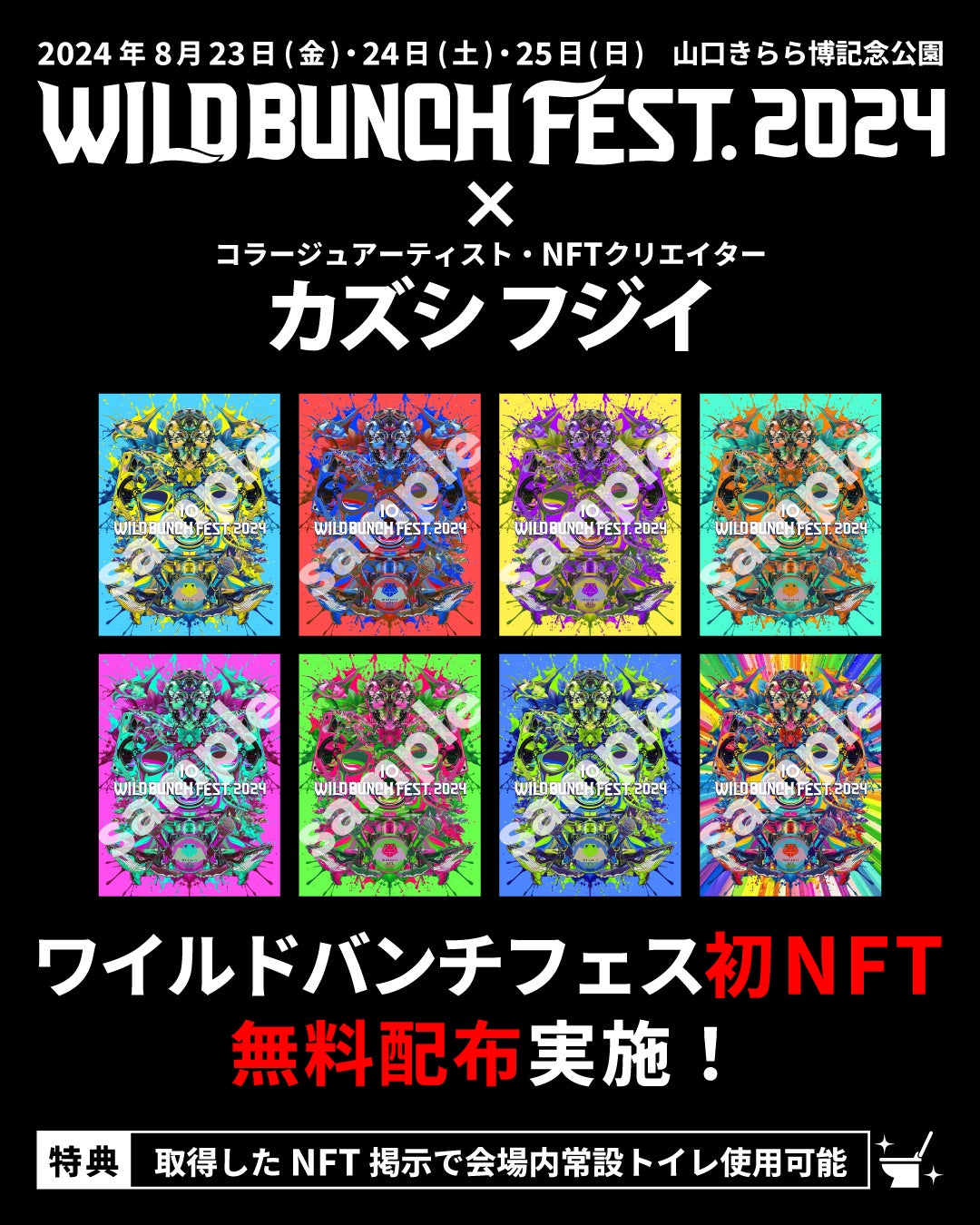 株式会社UPBOND(本社:東京都渋谷区/代表取締役:水岡 駿)は株式会社夢番地(本社:岡山県岡山市/代表取締役:岡田 哲)がプロデュースする「WILD BUNCH FEST. 2024(ワイルドバンチフェス2024)」にて、株式会社RAMPAGE(本社:広島県広島市/代表取締役:平石 尚)と協働し、NFT配布の実証実験を2024年8月20日から25日の期間にて実施致します。