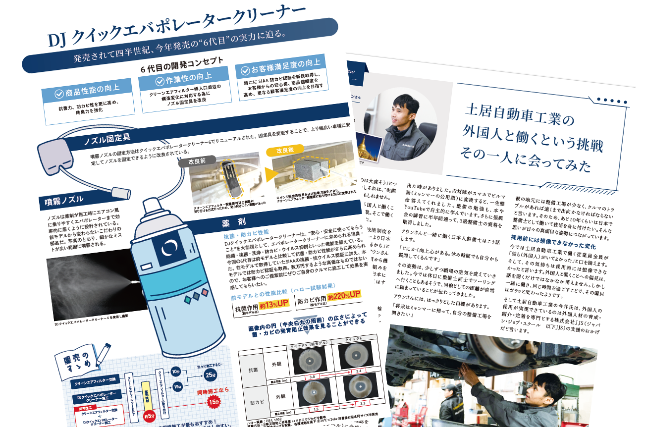 紙面を8ページに倍増した今月発刊の第2号は、同じくトヨタモビリティパーツ株式会社に取材し、夏に向けて需要の高まるエアコン洗浄剤(エバポレータークリーナー)を特集しています。加えて、整備業界に重くのしかかる人材不足について、外国人採用のリアルを兵庫県の土居自動車工業株式会社と、外国人材紹介事業の株式会社JJSに取材しました。