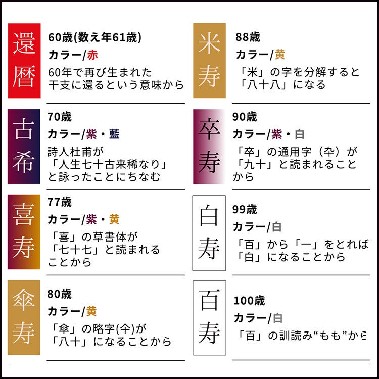 賀寿祝いの、どのお祝い事にもお贈りいただけるようカラーを取り揃えております。