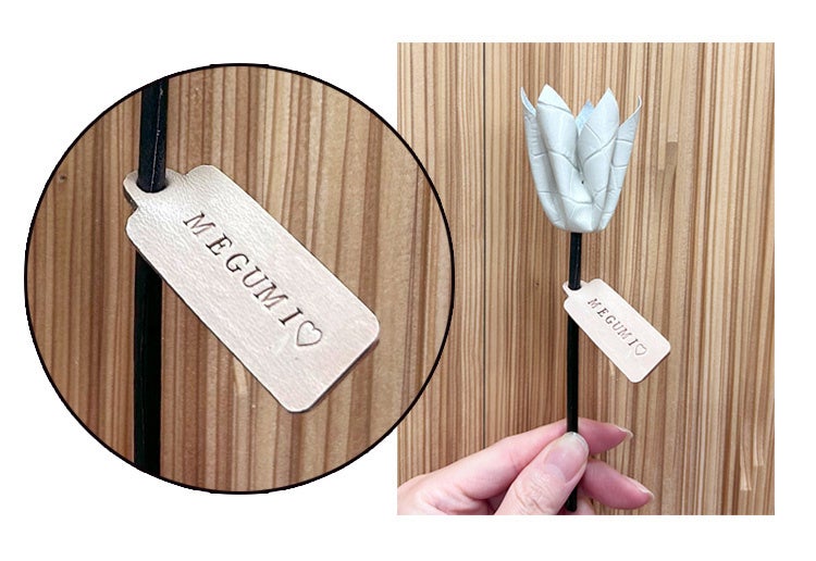 染色されていないヌメ革のタグに、大切な人への想いを手描きのメッセージに込めて心温まる贈り物に。