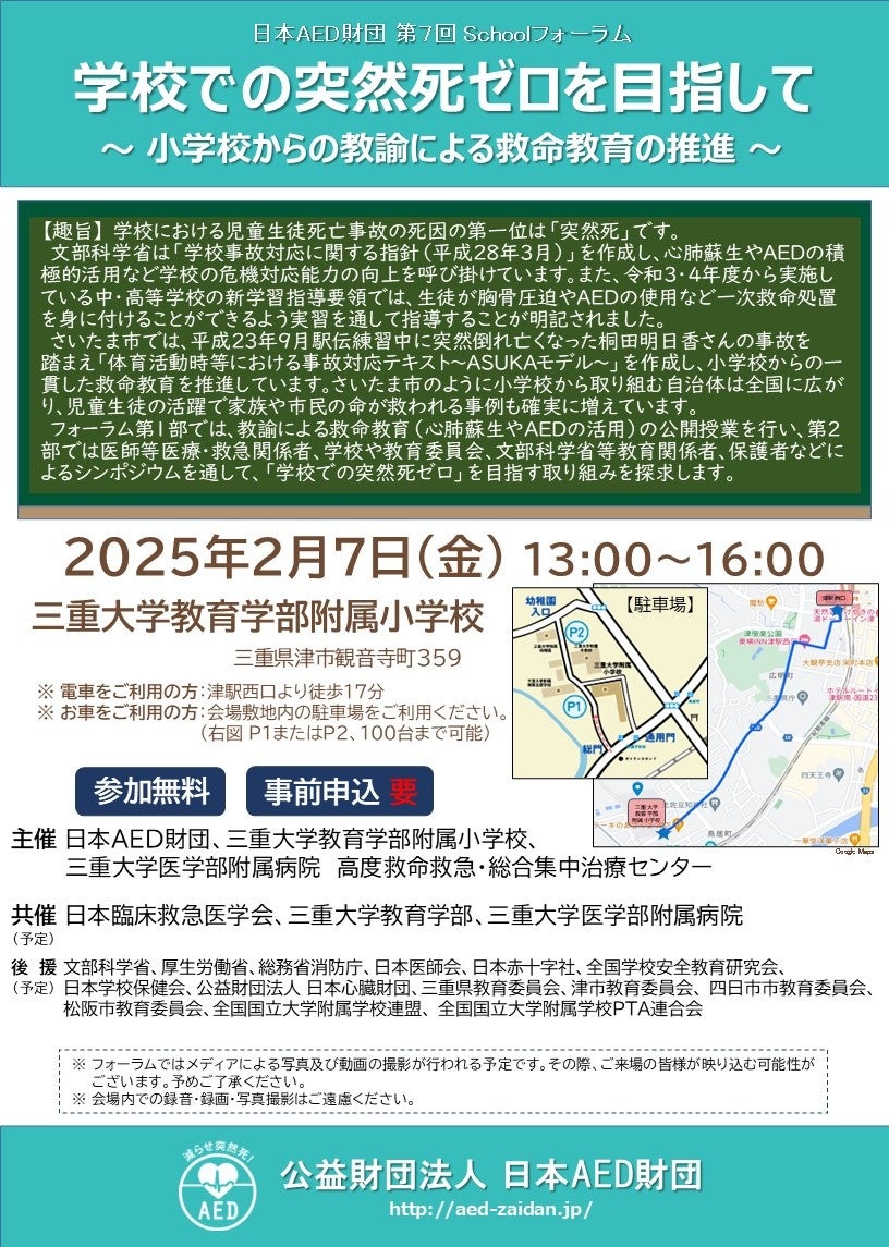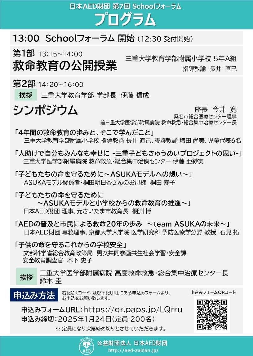 第7回 日本AED財団Schoolフォーラム を2025年2月7日(金)に三重大学教育学部附属小学校で開催することを決定いたしました。