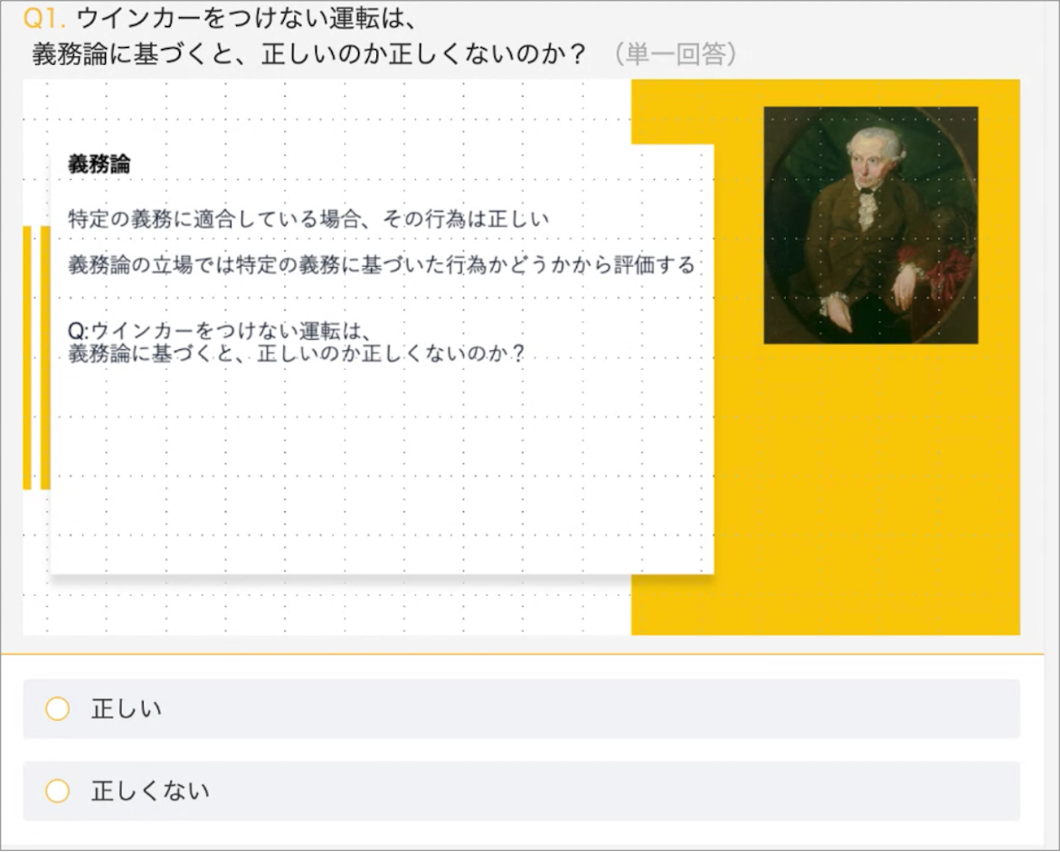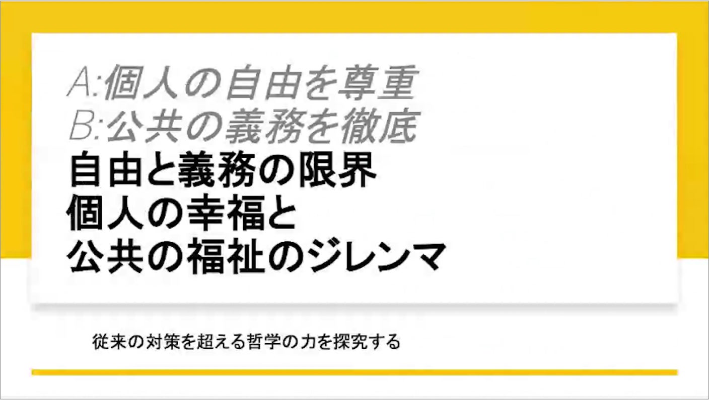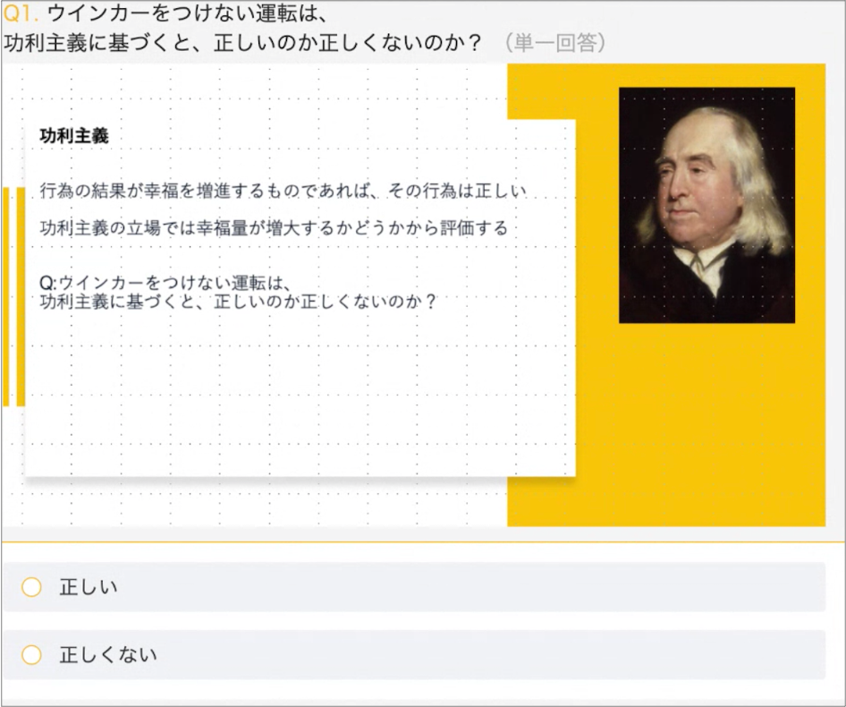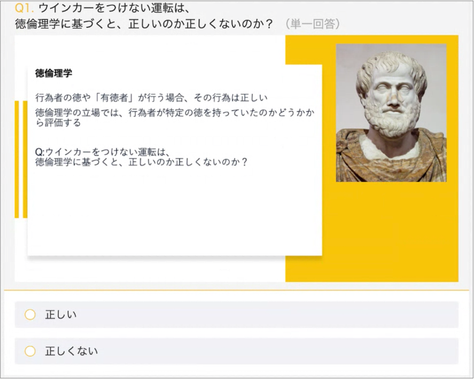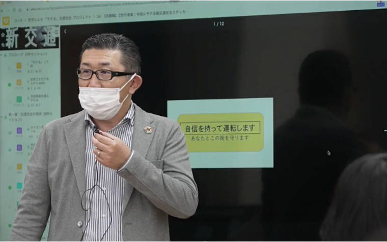 岡山県は、「10万人あたりの交通事故死亡率」全国1位を記録しています。そこには、「ウインカーを直前にしか出さない」といった「岡山ルール」と呼ばれる独自のルールがあると言われています。ワークショップでは、岡山ではなぜ交通事故が多いのか、地域性の問題?モラルの問題?ドライバーの意識?哲学的に考えることからスタートしました。哲学の「徳倫理学」を用いて、これまでの大人が作ってきた“カッコ悪い”ドライバー像から“かっこいい”ドライバー像へと常識を更新していきました。