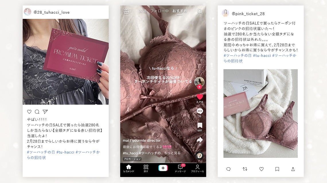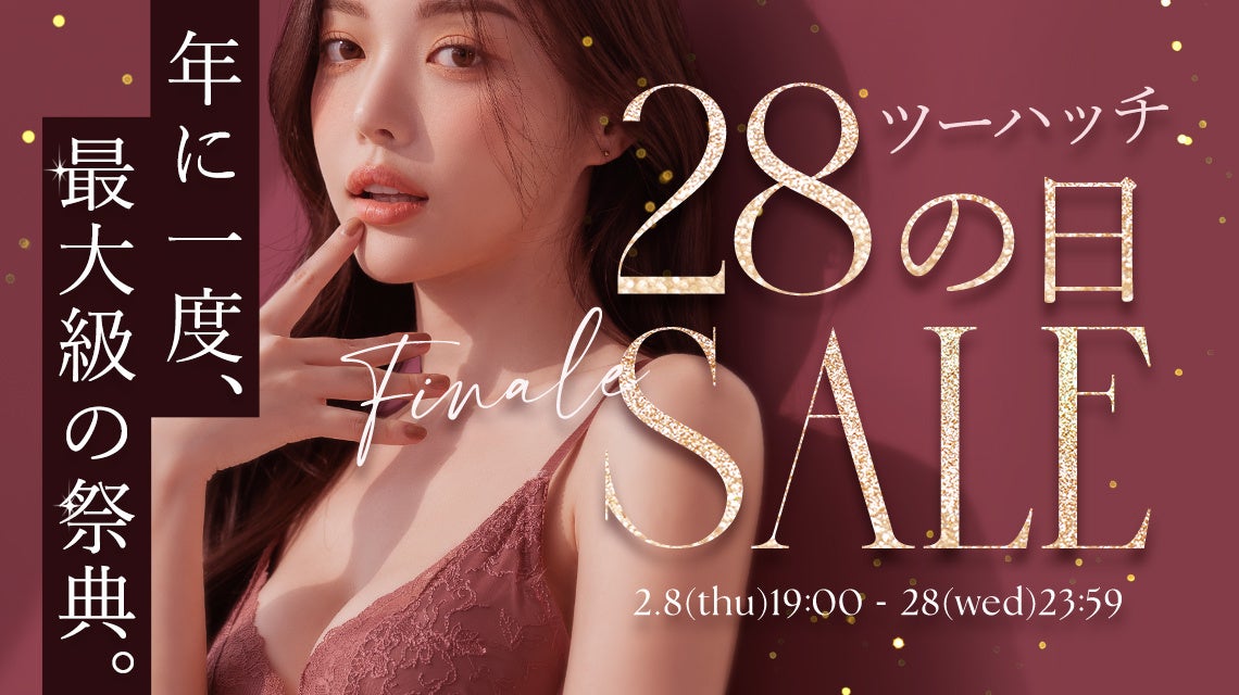 ブラジャーやナイトブラ、インナーを扱うレディースインナーブランドtu-hacci(ツーハッチ)では、ブランド名のツーハッチ(=28)にちなんで、毎年2月に”年に1度”の大型セールを開催!