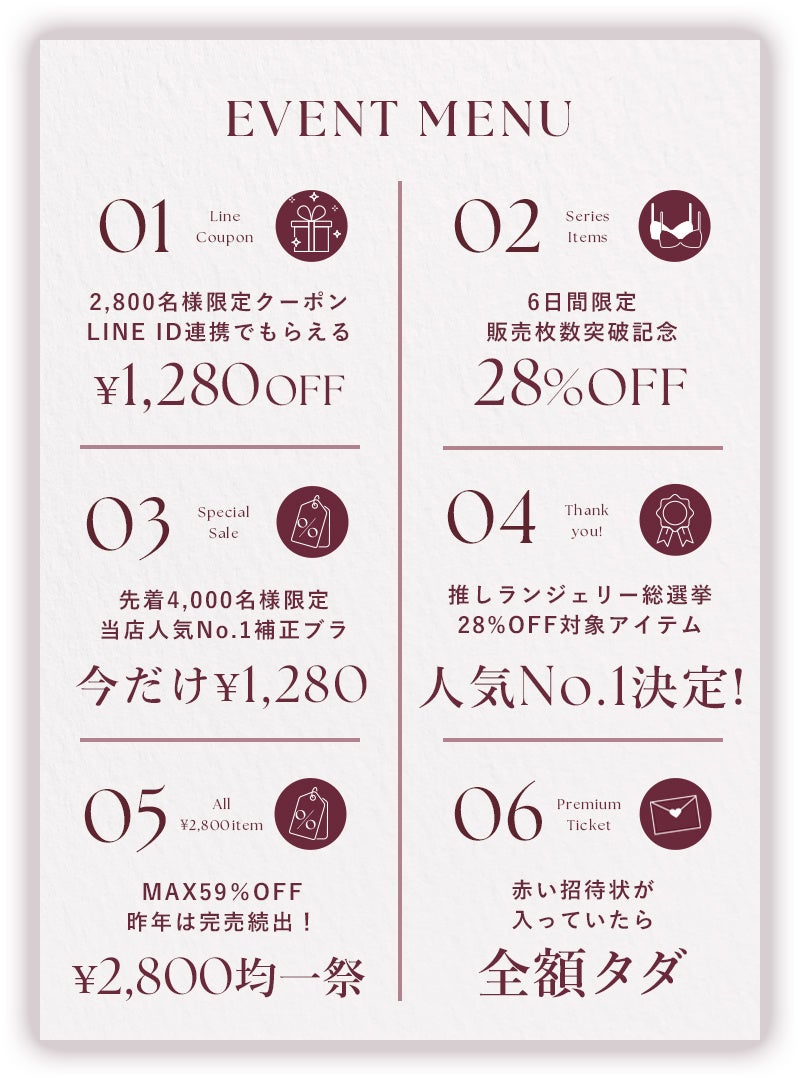 SNSで話題の『ご購入金額がタダになる赤い招待状』や、投票で人気商品がセール価格になる『推しランジェリー総選挙』など、特別企画を沢山ご用意しております。