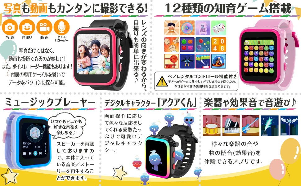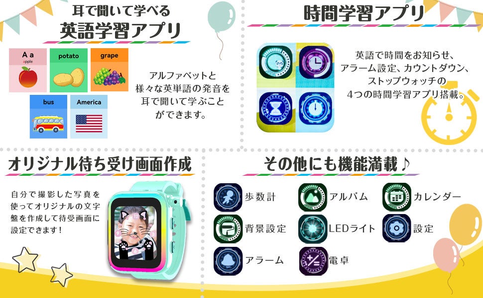 写真・動画・音楽・ライト・ゲーム・英語学習など全20アプリを搭載した、キッズスマートウォッチ。