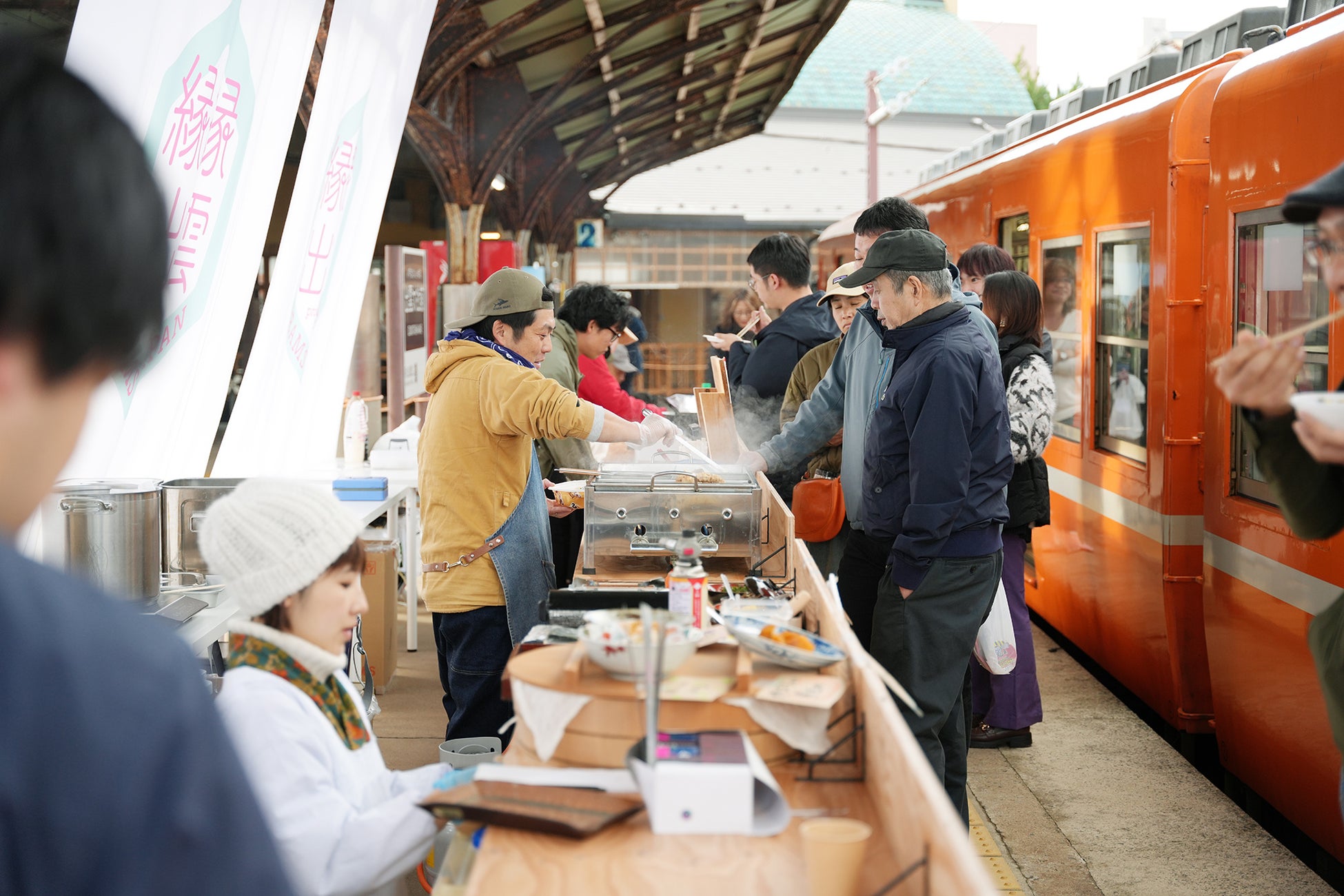 出雲大社前駅のホームに巨大屋台が出現。出雲の人気そば店による釜揚げ蕎麦や、地元食材を使ったカレーやラーメン、出店者自らが釣った魚で調理する串の炭火焼きや十六島海苔と魚のすり身揚げなど、ローカルな味覚を十分にお楽しみいただけます。また、出雲大社前駅構内にも屋台を配置し、駅全体を回遊しながら出雲の味覚を楽しんでいただけます。
