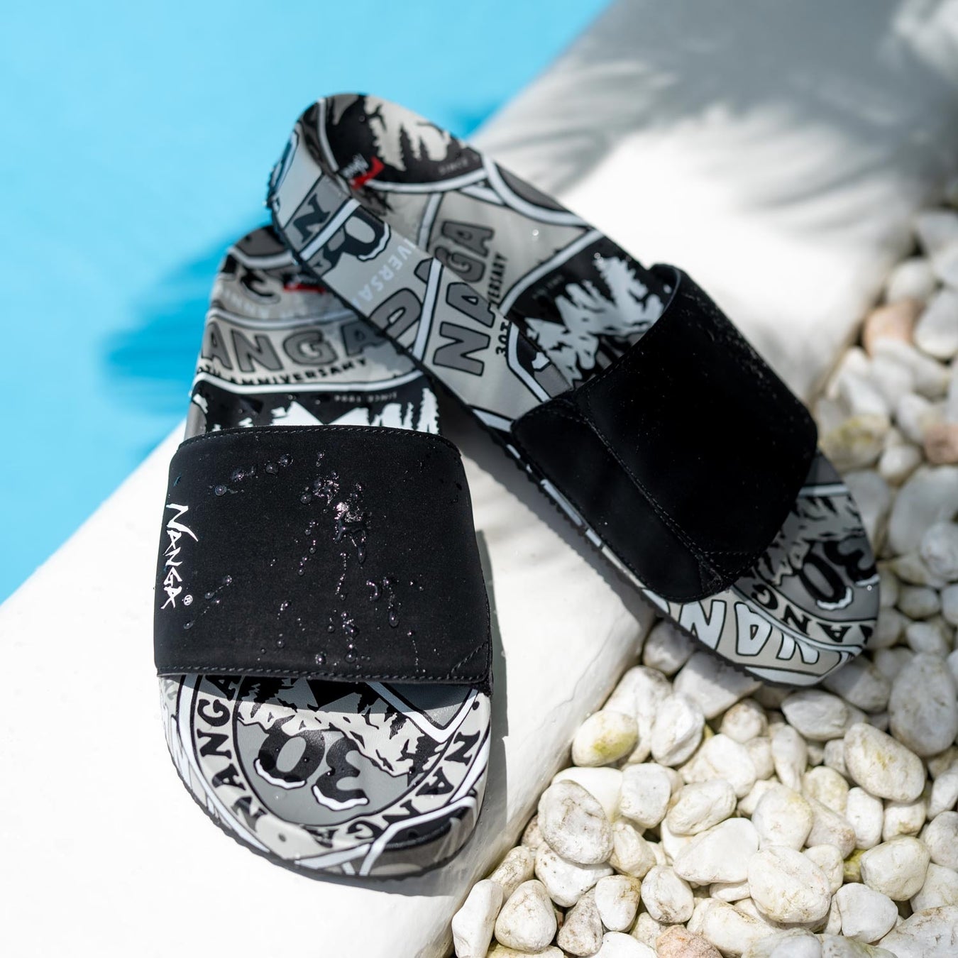 モノクロの30th annivデザインが特徴的なスライドサンダル。