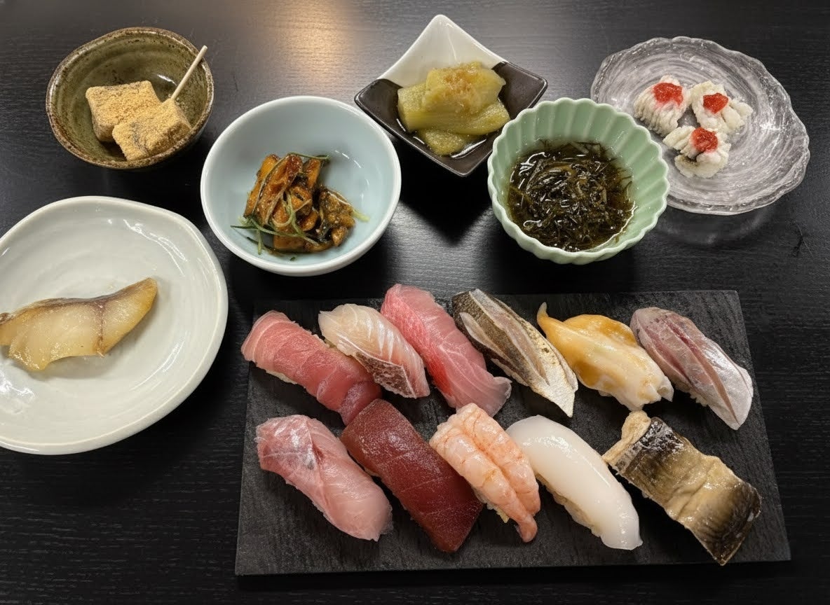 季節の前菜3種/旬のお造り/旬の焼物/握り10~12貫/お味噌汁/甘味