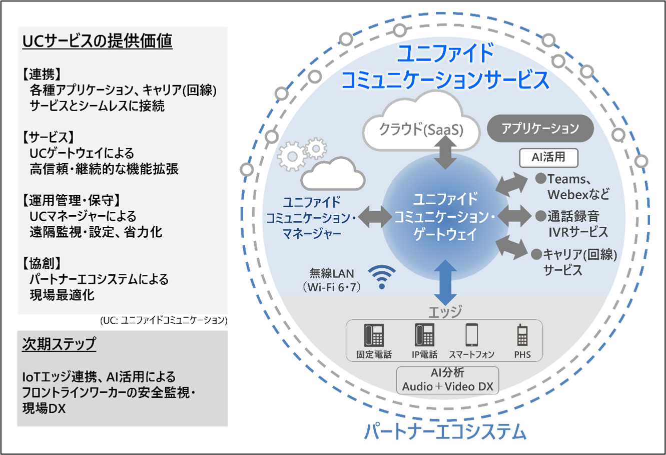 このUCサービスは、UCゲートウェイ、システムの遠隔監視・設定が可能なSaaS*2型「ユニファイドコミュニケーション・マネージャー」(以下、UCマネージャー)、および、接続されるIPテレフォニー機器から構成し、UCゲートウェイを介してMicrosoft TeamsやCisco Webexを始めとするさまざまなアプリケーションをWi-Fiなどのネットワークでつなぎ連携します。これにより、お客さまニーズに応える柔軟なコミュニケーション環境を実現するとともに、高信頼な運用、機能拡張、運用管理・保守業務の省力化など、導入から運用・保守までサポートし、継続的な価値を提供します。
