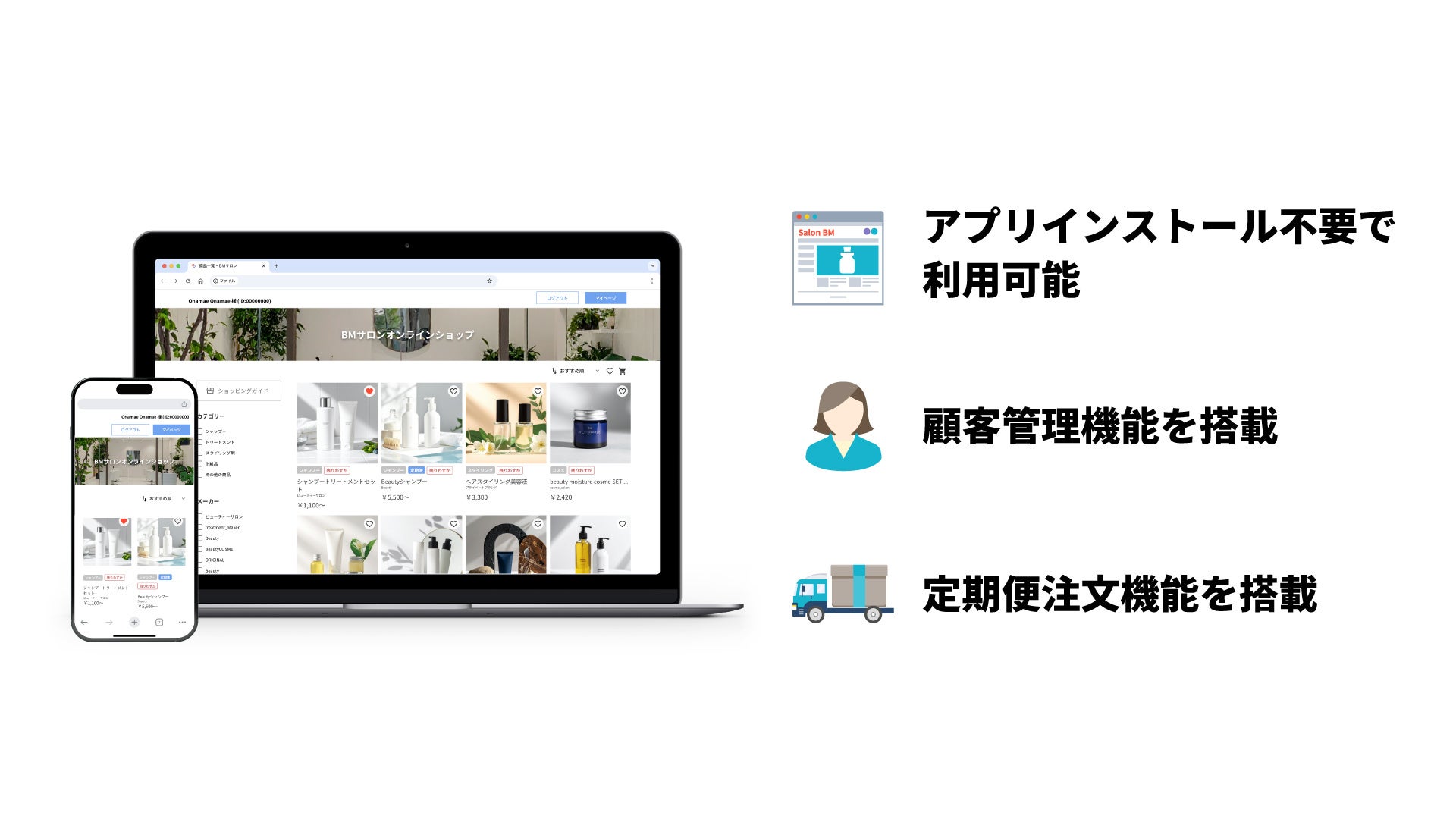 本機能は、理美容店舗がWEB上で店舗専用のオンラインショップを簡単に開設でき、顧客がいつでもどこでも商品を購入できる“アプリ不要のWEBオンラインショッピング機能”となっております。