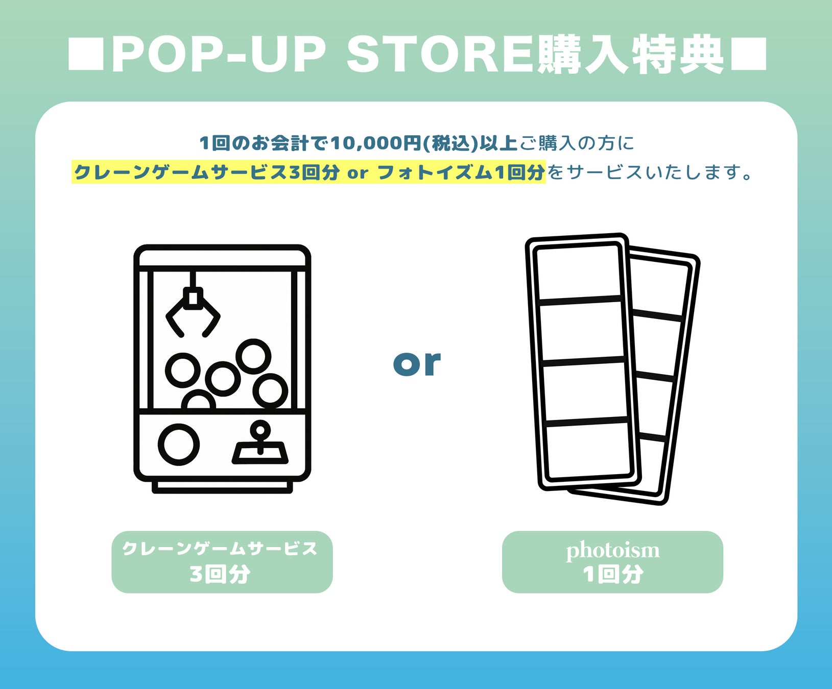 1回のお会計で10,000円以上ご購入の方にはクレーンゲームサービス3回分 OR フォトイズム1回分をサービスいたします。