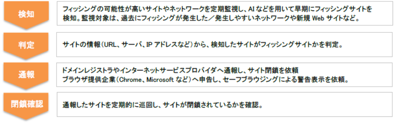 フィッシングサイトの報告が多い企業に対しては、自社での自発的なフィッシングサイト閉鎖対応の要請に加え、サイトの閉鎖対応に必要なノウハウの提供などを通じて、フィッシングサイト閉鎖に主体的に取り組める環境整備を共同で呼びかけ、業界横断でのフィッシング対策の推進に継続的に取り組んで まいります。