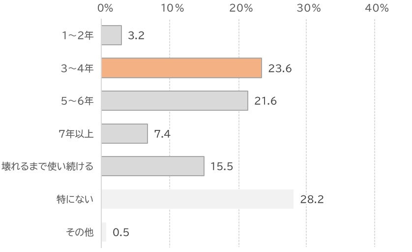 業務用ノートPCの実際の買い替えサイクルに関する設問では、44.3%の方が5年以上使っているという結果が出ています。しかし、理想的な買い替えサイクルを調査すると、「3~4年」と回答する方が多くなっています。これは、業務用ノートPCを使って3~4年目になると、何らかの「買い替えたい理由」が出てきているということが窺えます。