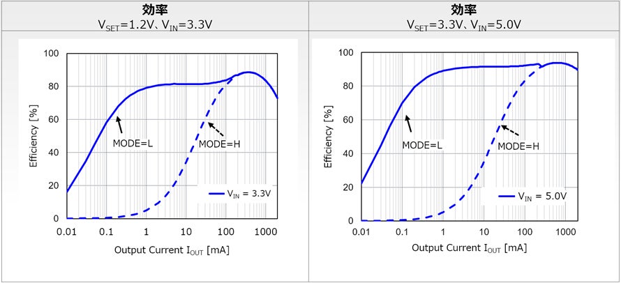 「NC2600シリーズ」は、PWM(Pulse Width Modulation)/PFM(Pulse Frequency Modulation)自動切り替えモードを搭載しており、出力電流に応じて自動でPWM/PFM動作が切り替わりますので、軽負荷時でも重負荷時でも高い効率が実現できます。(MODE端子に“L”の信号を入力した時に本機能が有効になります。)