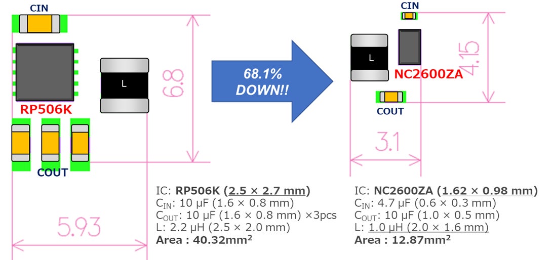 「NC2600シリーズ」は、最大電流2Aまで対応しながら、WLCSP-8-P11(1.62 × 0.98mm)の小型パッケージを採用しているのに加え、外形寸法が小さな周辺部品を使用しても動作するように設計しているため、周辺部品を含めて省実装面積で電源部品を配置することが可能です。