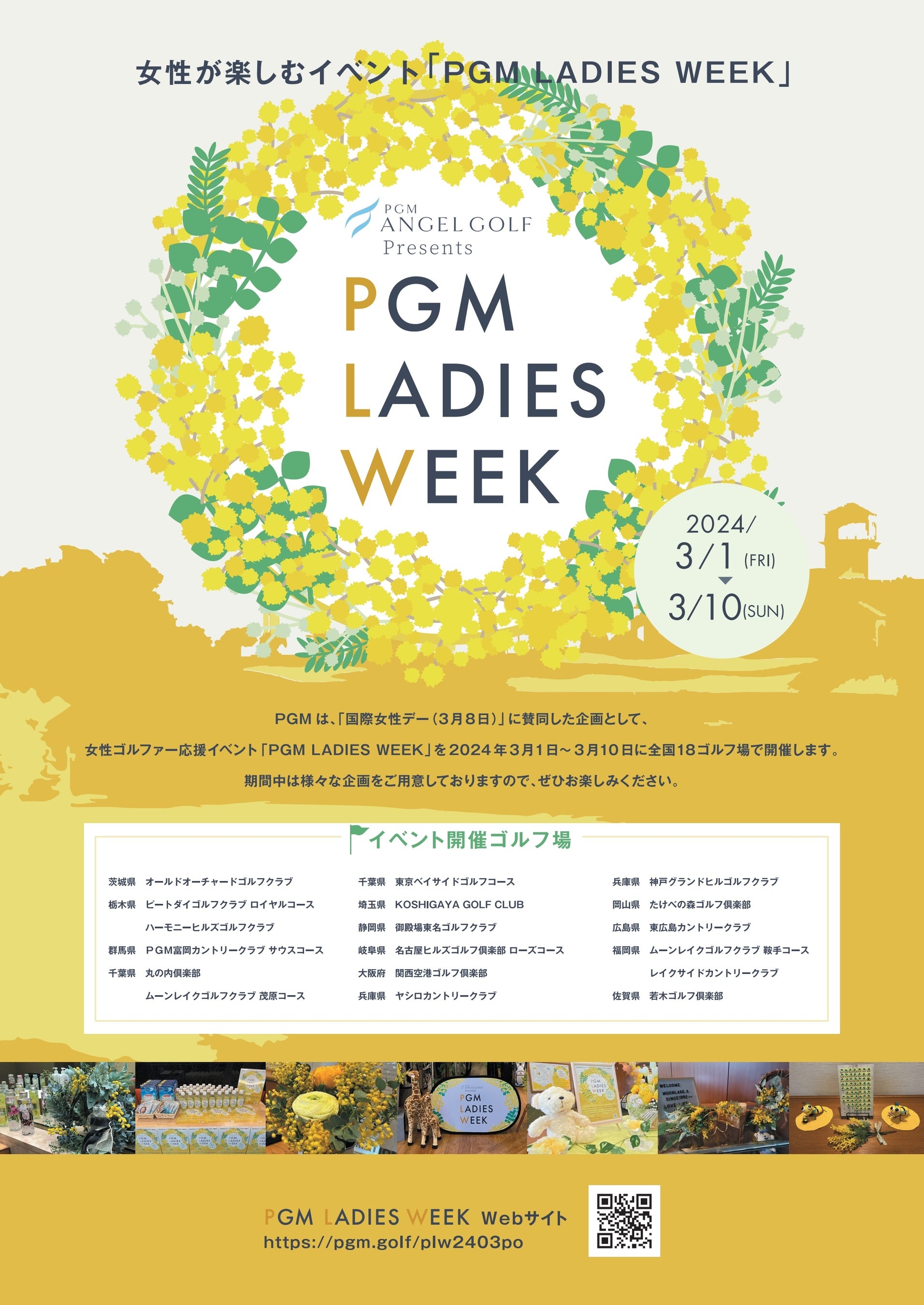本イベントでもミモザイエローをシンボルカラーとし、クラブハウス内も華やかに装飾をするほか、女性限定の特典を多数ご用意しています。ぜひこの機会にミモザイエローに包まれたPGMゴルフ場に訪れ、お楽しみください!