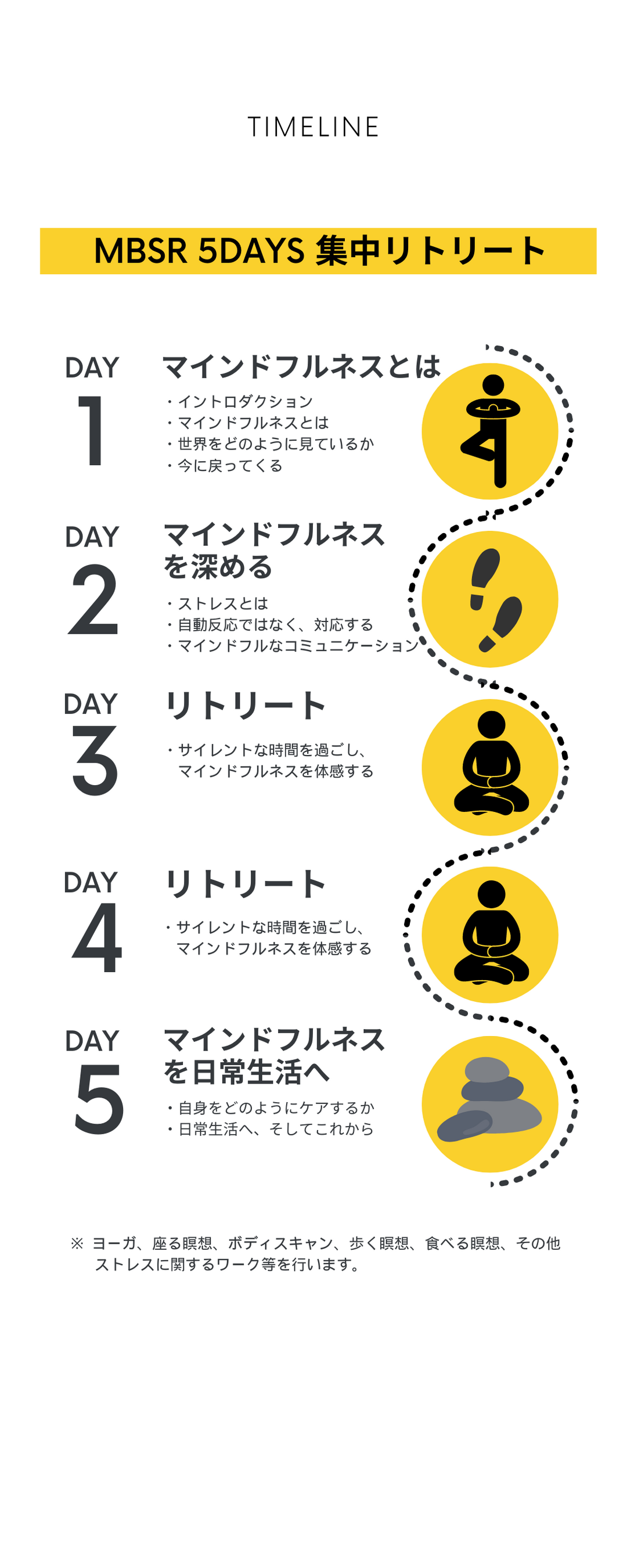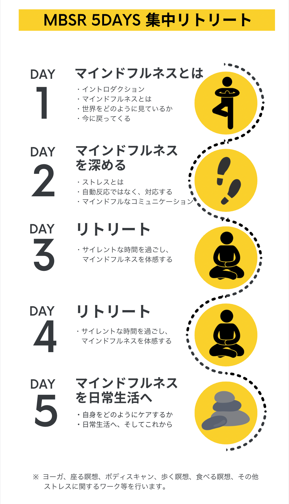 今回のリトリートは、様々なエビデンスベースのマインドフルネスプログラムの基盤となっている、マインドフルネスストレス低減法(MBSR)を5日間集中フォーマットで行います。