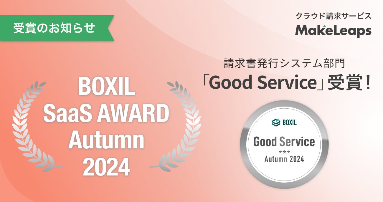 リコーグループのメイクリープス株式会社(本社:東京都目黒区、代表取締役社長:岡田 泰、以下メイクリープス)が提供するクラウド型請求管理サービス「MakeLeaps(メイクリープス)」は、スマートキャンプ株式会社(以下「スマートキャンプ」)が主催する「BOXIL SaaS AWARD Autumn 2024」請求書発行システム部門で「Good Service」に選出されました。9期連続での受賞となります。