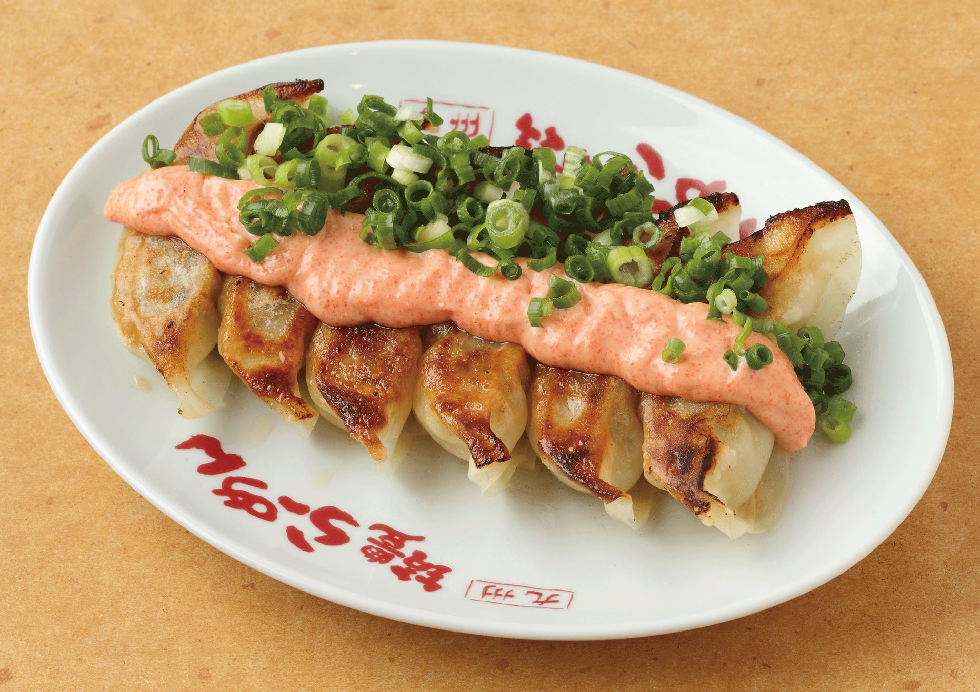 プチプチ明太子にマヨネーズをたっぷり混ぜ、焼き餃子のうえに豪快にトッピング。
