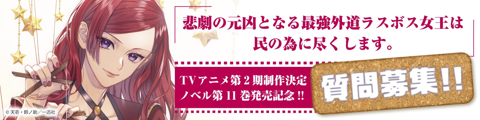 『悲劇の元凶となる最強外道ラスボス女王は民の為に尽くします。』ノベル第11巻の発売とTVアニメ第2期の制作決定を記念してラス為キャラクターたちへの質問を募集いたします。この機会にぜひご参加ください。