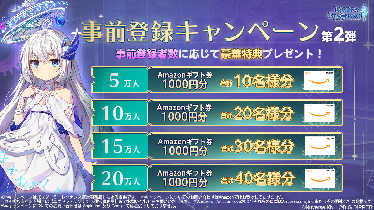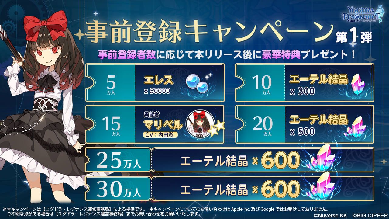 事前登録者数に応じて、ガチャ等で使える「エーテル結晶」や育成アイテム「エレス」、また異能者(キャラクター)「マリベル」など、正式サービス開始時の配布報酬が増えるキャンペーンを実施。