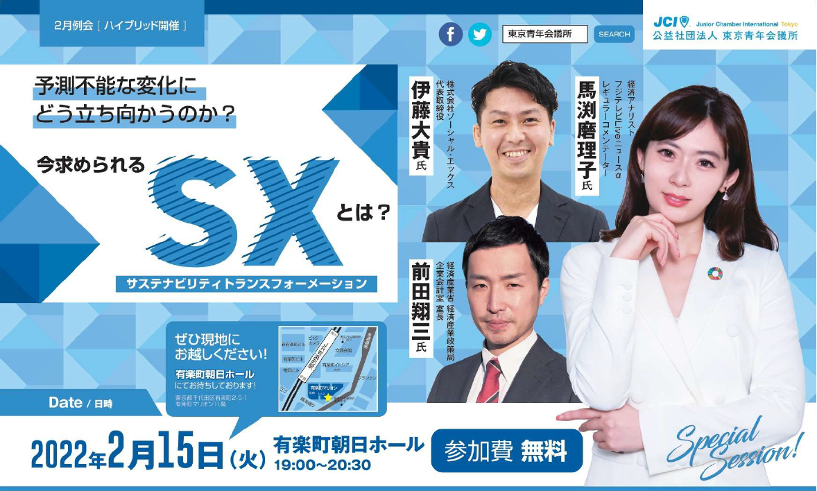 公益社団法人東京青年会議所(所在地:東京都千代田区平河町、理事長:山本健太)は、2022年2月15日(火)19時00分から「2月例会-予測不能な変化にどう立ち向かうのか、今求められるSXとは-」を、有楽町朝日ホール(東京都千代田区有楽町)にて開催します。また当日はYouTubeにて生配信を行い、事業開催後にはアーカイブ配信も行います。