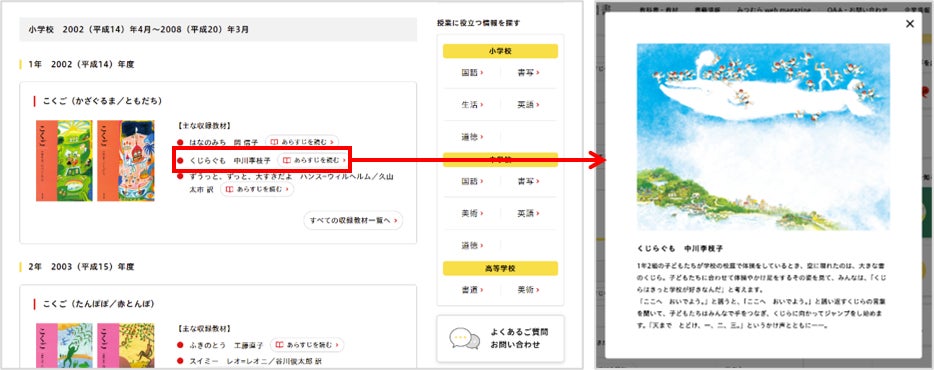 今回のリニューアルにより、「わたしの教科書検索」の検索結果に表示される、国語教科書の主要な収録教材にあらすじと挿絵が追加され、さらにその年代に流行したもののイラストが表示される“お楽しみ要素“も加わりました。またリニューアルを記念して、世代も背景も違う3名の「言葉のプロ」が子どもの頃に使っていた教科書や当時の授業について振り返り、語り合う座談会の記事も公開いたします。