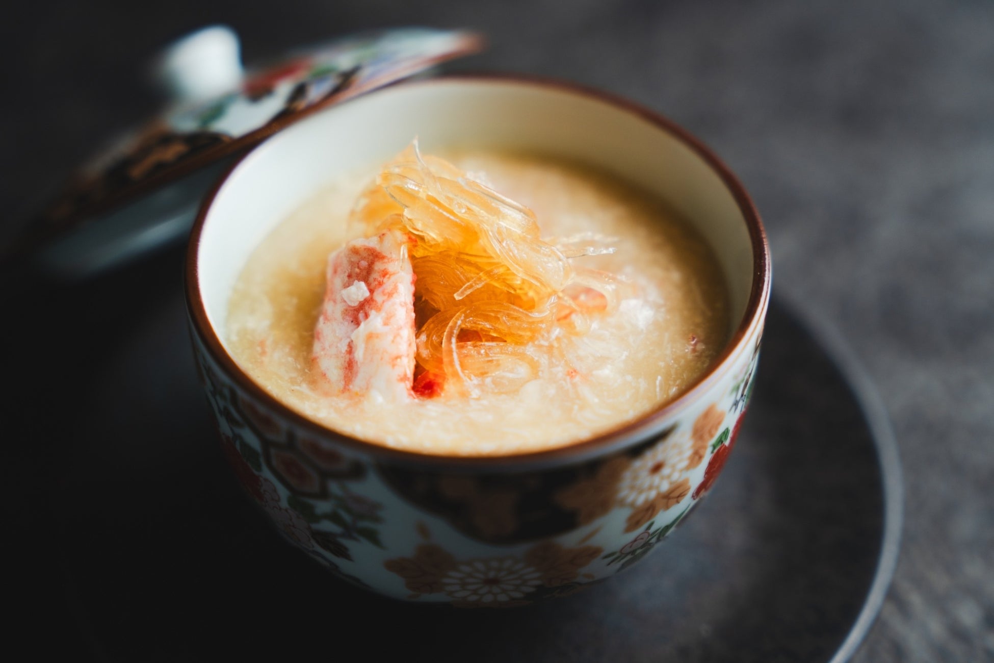 毛ガニを使った塩味のあっさりしたあんかけに、繊維が細くきれいなヨシキリザメのフカヒレをトッピングしました。やさしい味わいの滑らかな舌触りの茶碗蒸しに繊細な蟹とフカヒレの触感と香りがアクセントとなった贅沢な一品です。