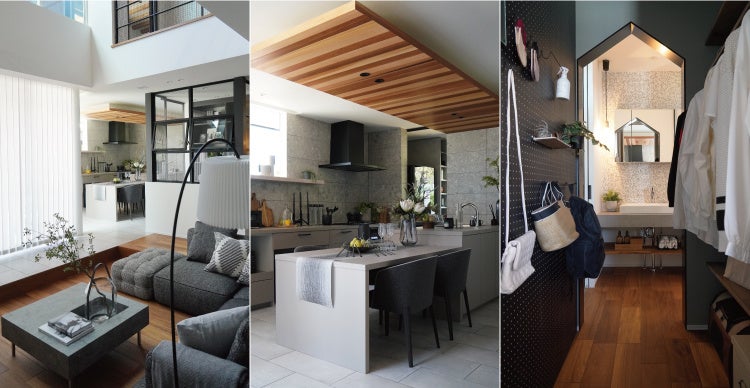 モデルハウス内は、ニューノーマル時代に対応した動線計画で、ご家族がそれぞれのスタイルでくつろいでいただけるLDK空間、大開口サッシと自然素材に包まれた吹抜空間、落ち着いた印象の色彩構成とともに自然の中に身を置いたようなインテリアイメージで構成しております。さらに、大切なペットとの生活もより充実するよう、換気扇付きのペットコーナーやペット用品に適した吊り収納を設け、心地よく暮らせるペット共生プランになっております。
