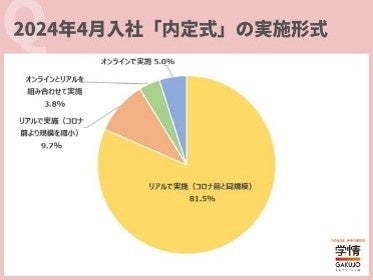 株式会社学情が実施した、「内定式」に関する調査の結果によると、8割以上の企業が「リアル」かつ「コロナ禍前と同規模」で内定式を実施することが明らかになりました。2024年4月入社の『内定式』の実施形式は、「リアルで実施(コロナ禍前と同規模)」との回答が81.5%で最多で、「リアルで実施(コロナ禍前より規模を縮小)」が9.7%、「オンラインで実施」が5%、「オンラインとリアルを組み合わせて実施」が3.8%と続き、リアル開催への動きが加速していることが分かりました。
