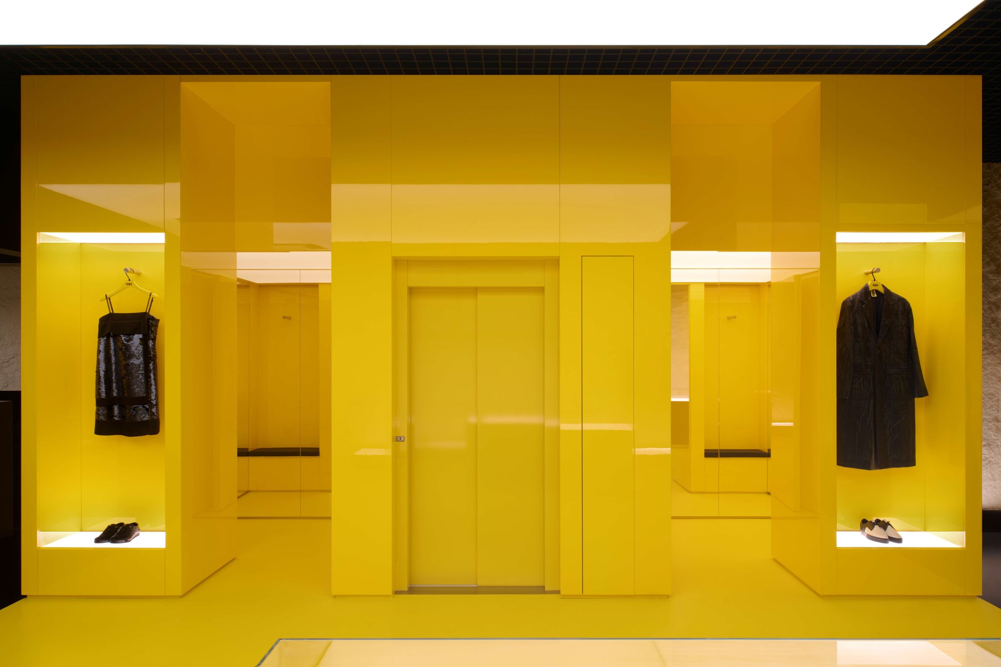 1Fは、Onitsuka Tigerのシグネチャーカラーであるイエローに統一された光沢感のある内装のリテールスペースで、東京の活気に満ちたモダンなエネルギーを彷彿とさせます。光を反射する壁と磨き上げられた床が開放的でダイナミックな空間を演出する一方、洗練された格子模様の天井とライトアップされたパネルが近未来的なタッチを添えます。 自然光が店内に差し込む様子は、グラシア通りに佇むこの壮麗な建築物にオマージュを捧げています。