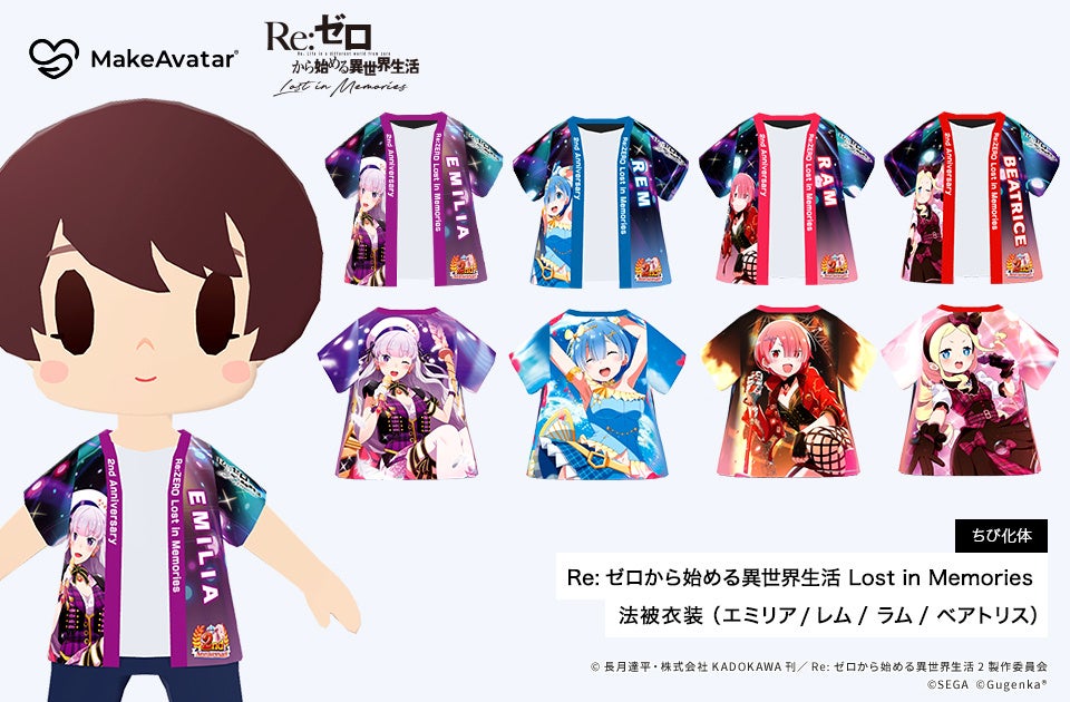 「エミリア」、「レム」、「ラム」、「ベアトリス」の4種類の法被で、衣装を着て4人を応援することができます。アバター制作アプリ「MakeAvatar」で使用することができるアバター衣装で、作成したアバターに衣装を着せかえてバーチャル会場へ遊びに行くことができます。