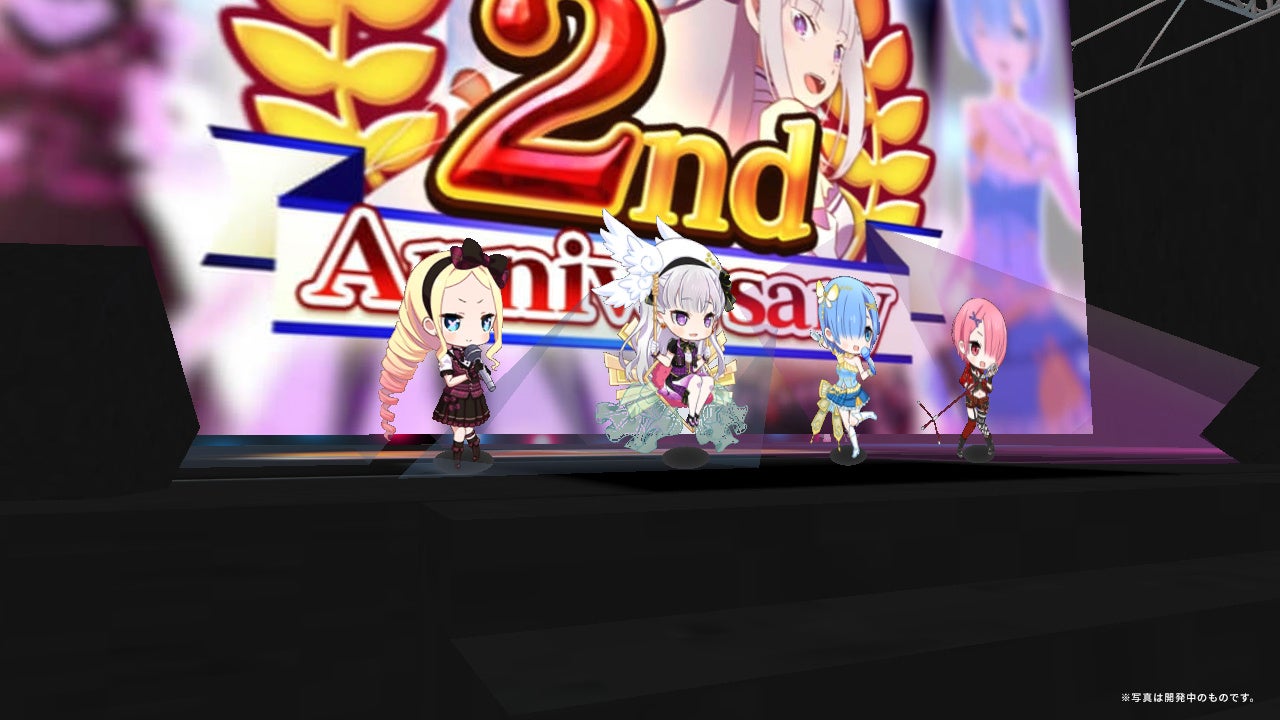 ライブステージにはリゼロの人気キャラクター「エミリア」、「レム」、「ラム」、「ベアトリス」のアイドル衣装の立ち絵を展示しています。