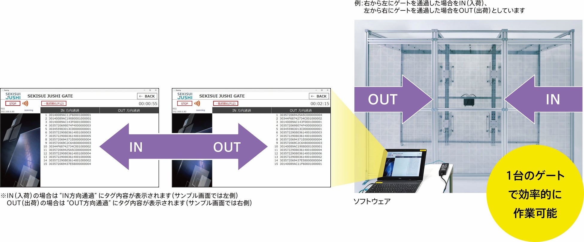 右から左にゲートを通過した場合をIN(入荷)、左から右にゲートを通過した場合をOUT(出荷)とし、1台のゲートで入荷/出荷作業が可能になるため、作業性が向上