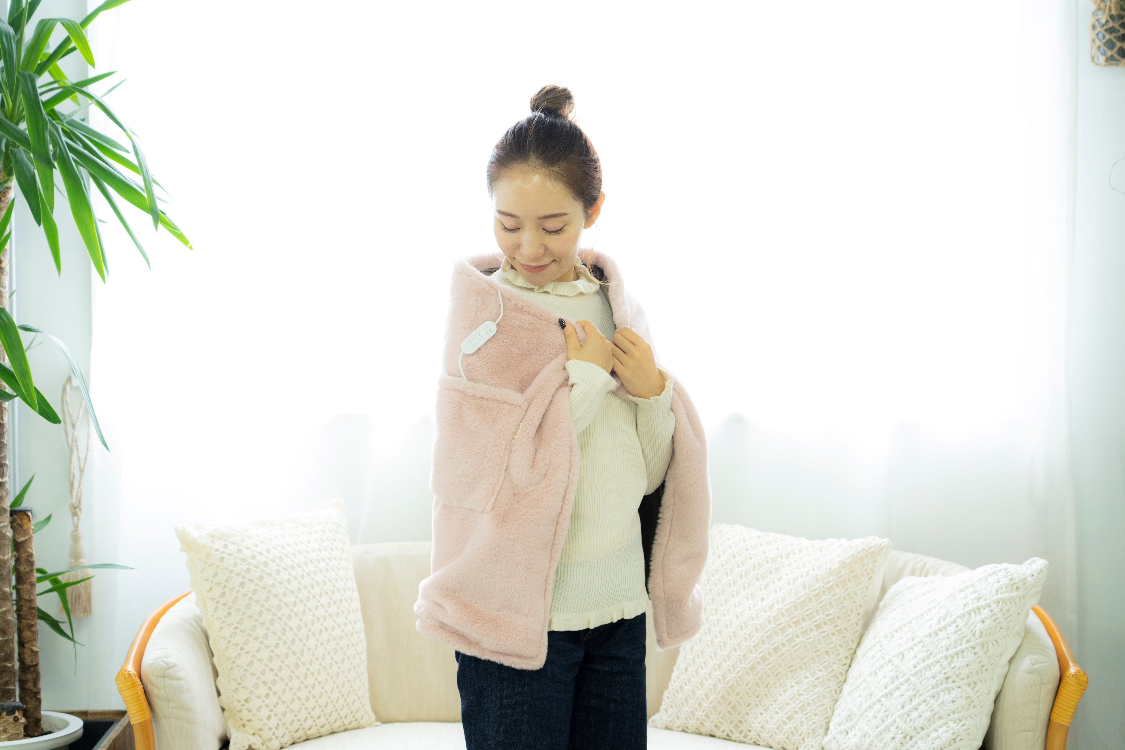 ひざ掛け、ポンチョ風、巻きスカート風の3WAYで使用できます。モバイルバッテリーの収納に便利なポケット付き。ヒーターを取り外しても使用できます。