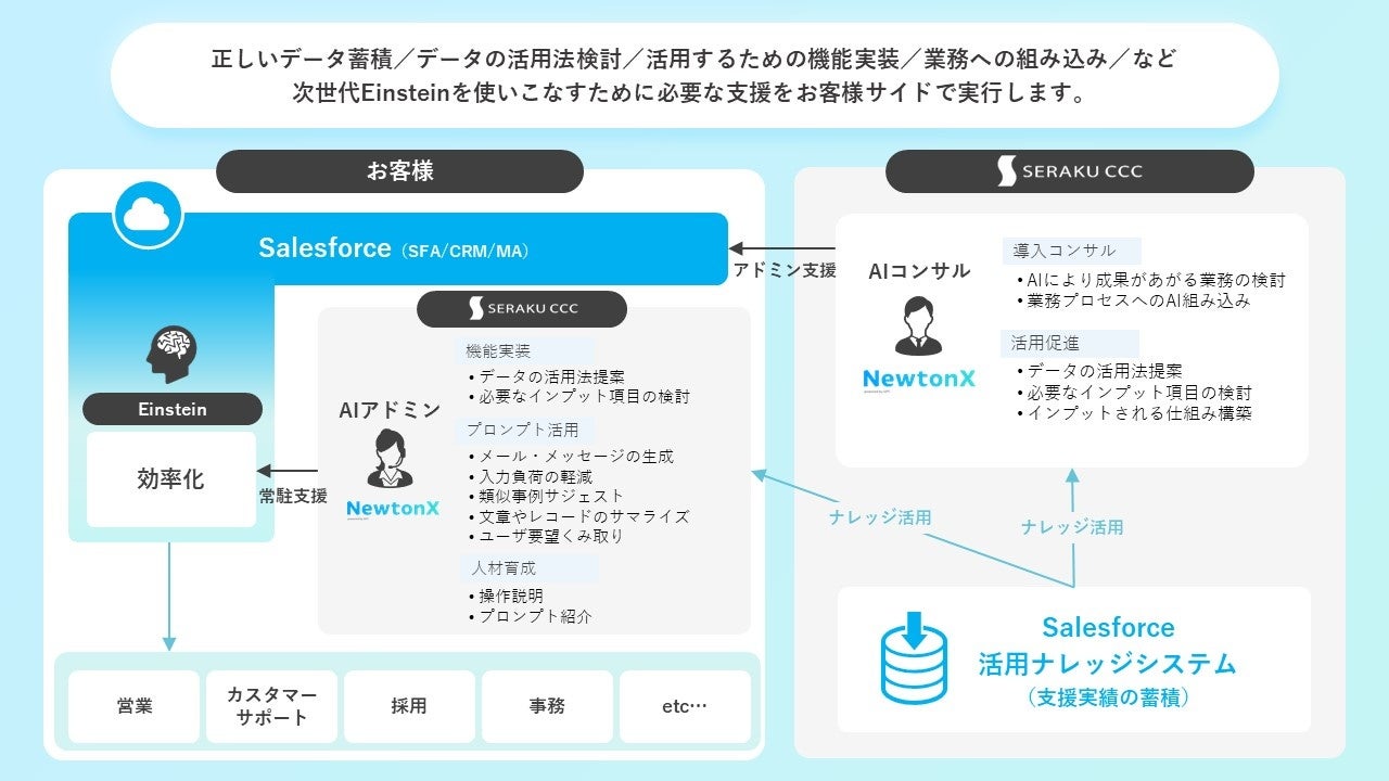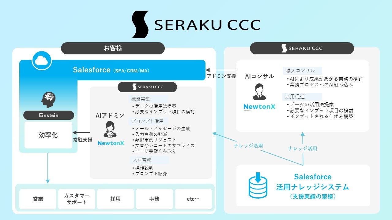 セラクCCCは2013年より「カスタマーサクセスソリューション事業」として顧客管理(CRM)、営業管理(SFA)、マーケティングオートメーション(MA)、ビジネスインテリジェンス(BI)をはじめとするクラウドシステムの運用・定着化支援事業を行っており、在籍する300名以上のクラウド人材が400社以上の顧客企業に対しクラウドシステムの運用・定着化を支援しています。そこで、今回の「Einstein 1 Platform」及び次世代版「Einstein Copilot」の提供開始スケジュールリリースを受け、Salesforceの定着活用に課題を抱えている企業やより高度な活用を目指していきたい企業に向けて、より高度な定着活用コンサルティングと運用支援を行ってまいります。