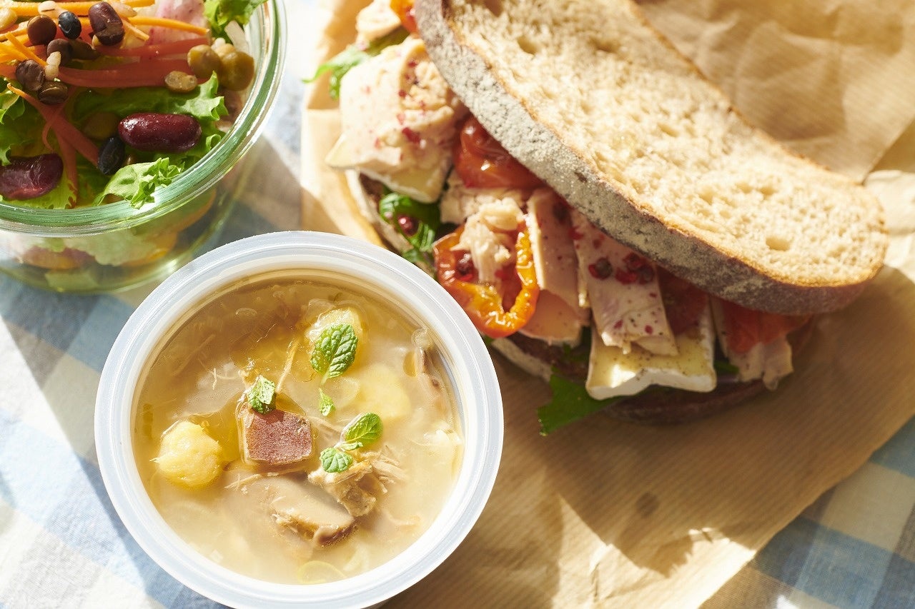 ヘルシーな蒸し鶏を使用し、さっぱりとした味わいに仕上げたスープは細切り生姜がたっぷり入って、寒い冬に体を内側から温めてくれます。もち麦のぷちぷちした食感に、さつまいもの甘みを感じられ1杯で大満足のスープ。さらにブラックペッパーを加えることでピリッとスパイシーさもプラス。蒸し鶏が入って79Kcalの低カロリー。