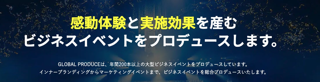「株式会社グローバルプロデュース」は、「イベントプロデュースを通じて世界中に幸せを届ける」ことをビジョンに掲げる、総合イベントプロデュースグループです。単なる手配屋としてではなく、お客様の想いをイベントというカタチにし、実施効果を最大化するためのお手伝いをさせていただいています。「日本発、世界へ通用するイベントプロデュースの提供」を目指し、皆様にとって最高のクリエイティブやサービスを提供します。