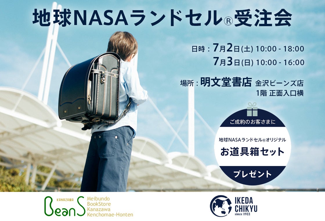 ランドセルの企画・販売を行う池田地球株式会社(本店:東京都港区:代表取締役 村尾光一)は、2022年7月2日(土)~7月3日(日) の期間限定で、石川・明文堂書店 金沢ビーンズ店1階正面入口横にて「地球NASAランドセル®受注会」を開催いたします。