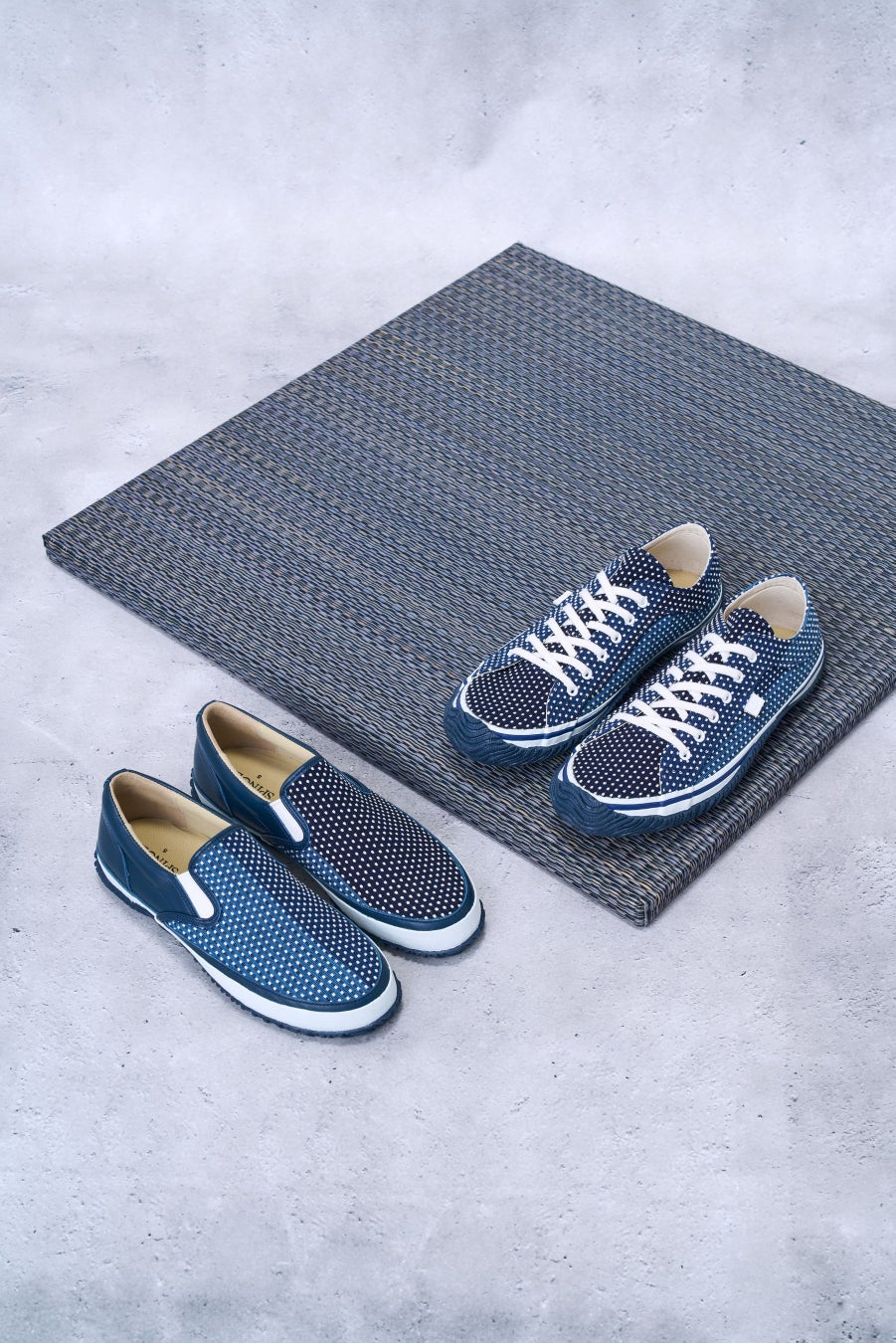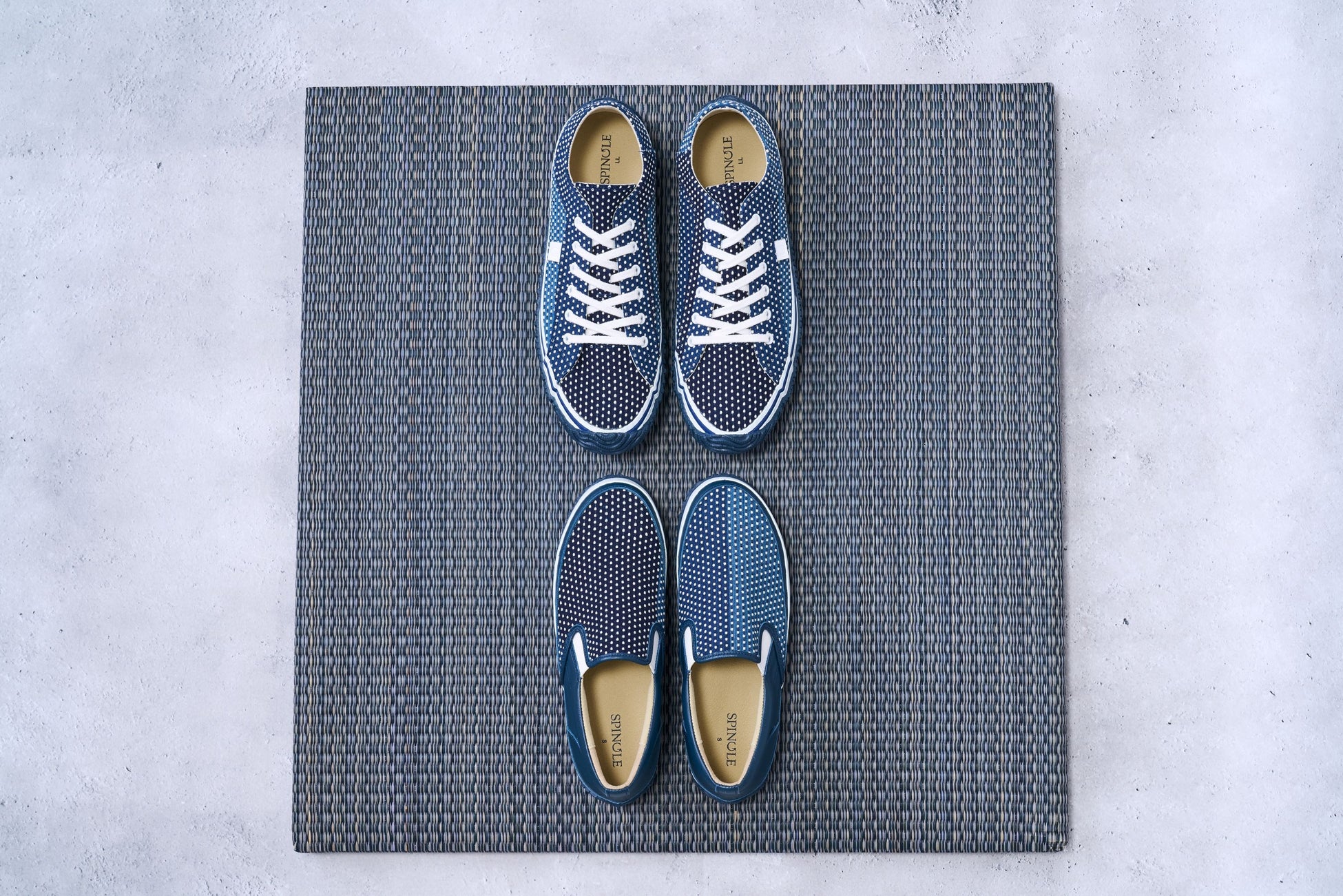 「SP-1062」は、かつお縞刺し子の濃い藍色から薄い藍色へのグラデーション模様をSPINGLEの定番ローカットモデル「SP-1057」に落とし込んだスニーカー。生地の裁断位置により左右及び商品毎に柄の出方が異なります。