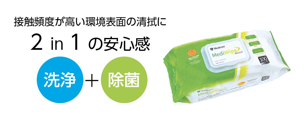 「メディワイプ」は、洗浄と除菌が同時に⾏える2 in 1の環境清拭⽤ワイプです。