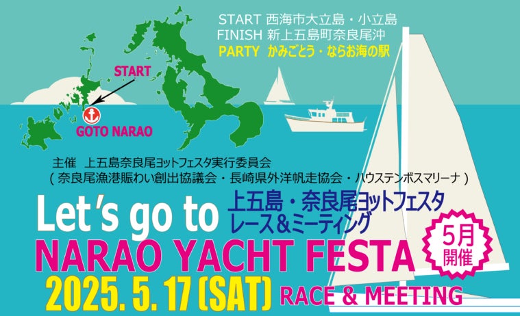 上五島・奈良尾ヨットフェスタ実行委員会(奈良尾漁港賑わい創出協議会、長崎県外洋帆走協会、ハウステンボスマリーナ)は、令和7年5月17日に、本土と新上五島町を結ぶ初めてのヨットレースとして、「第一回 上五島・奈良尾ヨットフェスタ 2025」を開催します。