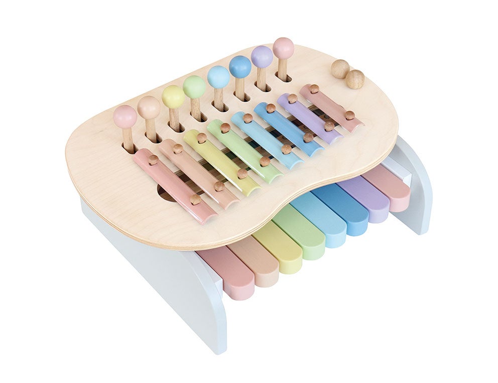 鍵盤を押したり、鉄琴をスティックで叩いたりして音を楽しむことができます。鍵盤を押すと丸いモチーフがぴょこぴょこと動き、音と動きが連動することで大きな喜びを感じることができます。